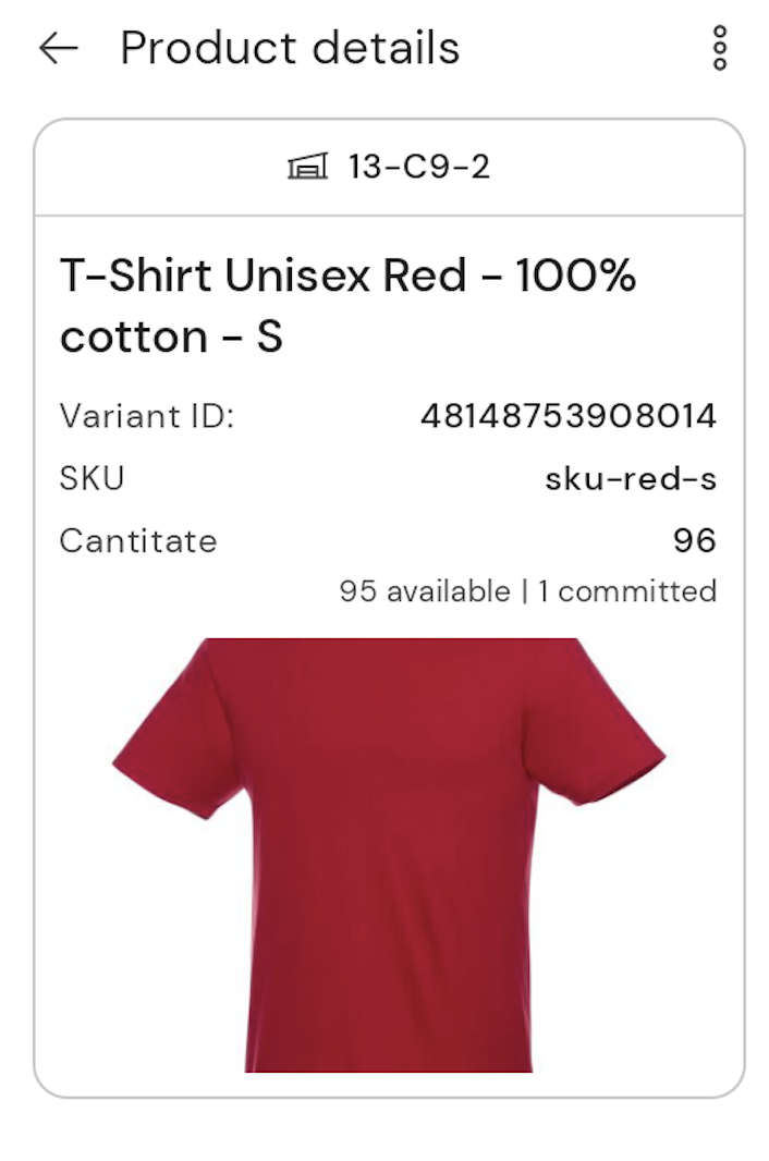 The product's location in the warehouse. Save for each product variant details like row, row unit, and shelf in the mobile application so you can easily acces this info and you can pick the products from the right spots quickly.