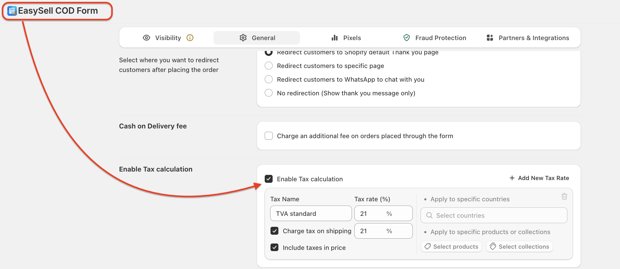 Shopify > Settings > Taxes and duties > enable Collecting tax