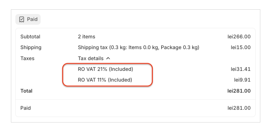 Dupa ce procesati comenzile vechi - adica primite inainte de setarile de tva corecte si complete - scoateti optiunea Force vat payer: No Force vat payer este o optiune care suprascrie ce cota tva a calculat Shopify insa e valabila doar pentru o singura cota generala ci nu 2 cote separate