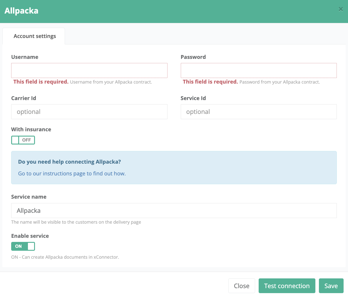 Go to xConnector → Profile → Connected Services → Connect a new service → Shipping labels → Connect a courier → Allpacka