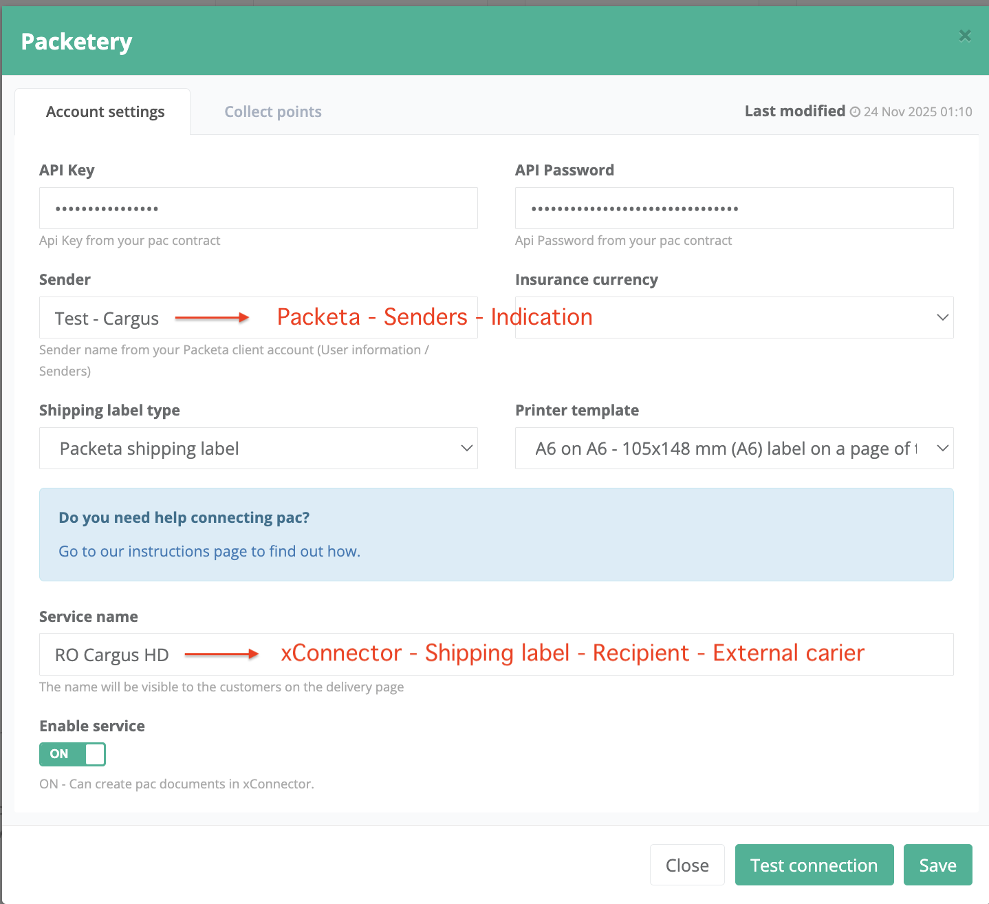 Connect a separate Packeta connector for each sender and each external carrier, and rename the service name to match the correct service.API Key - fill in the API Key