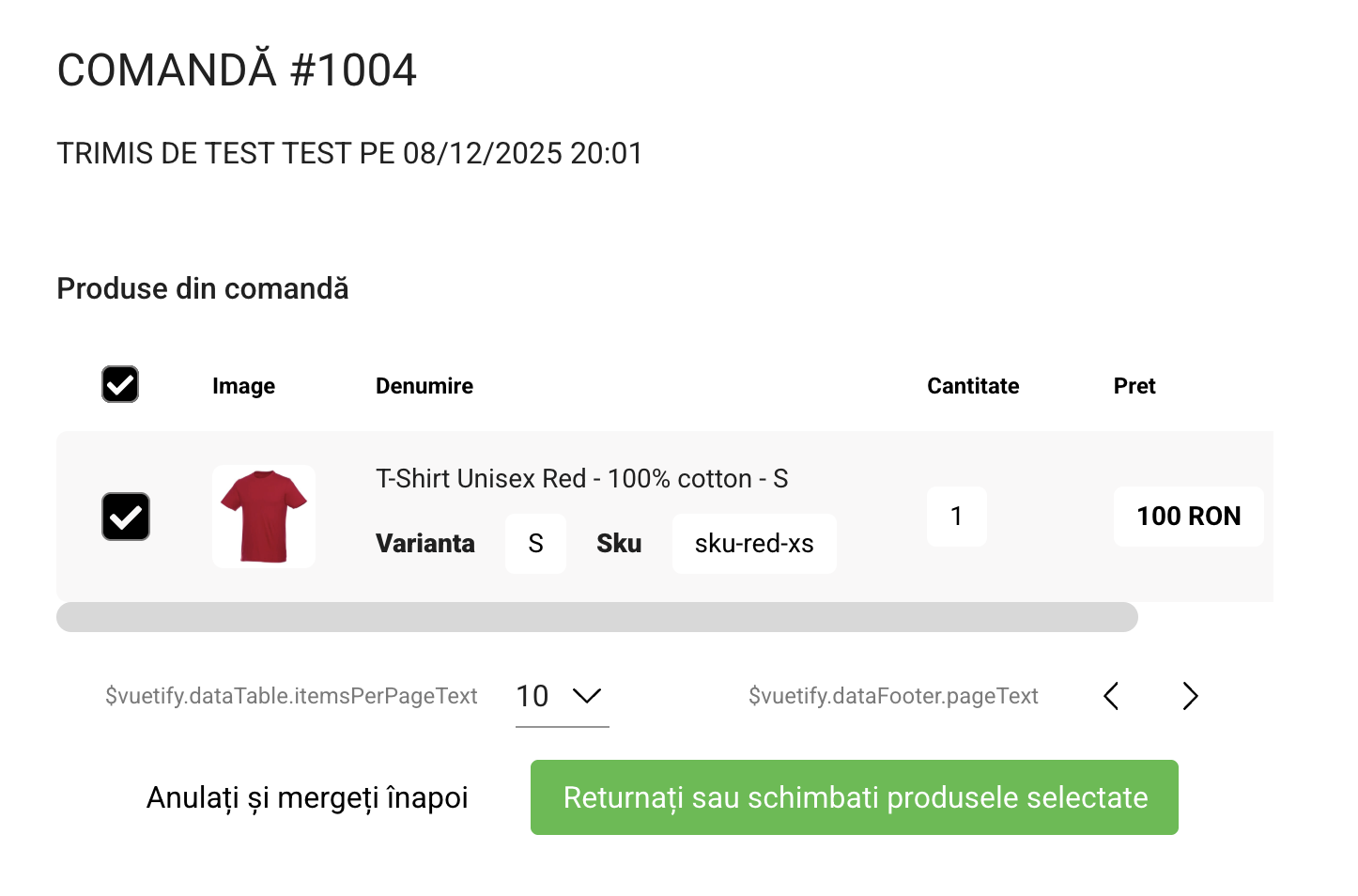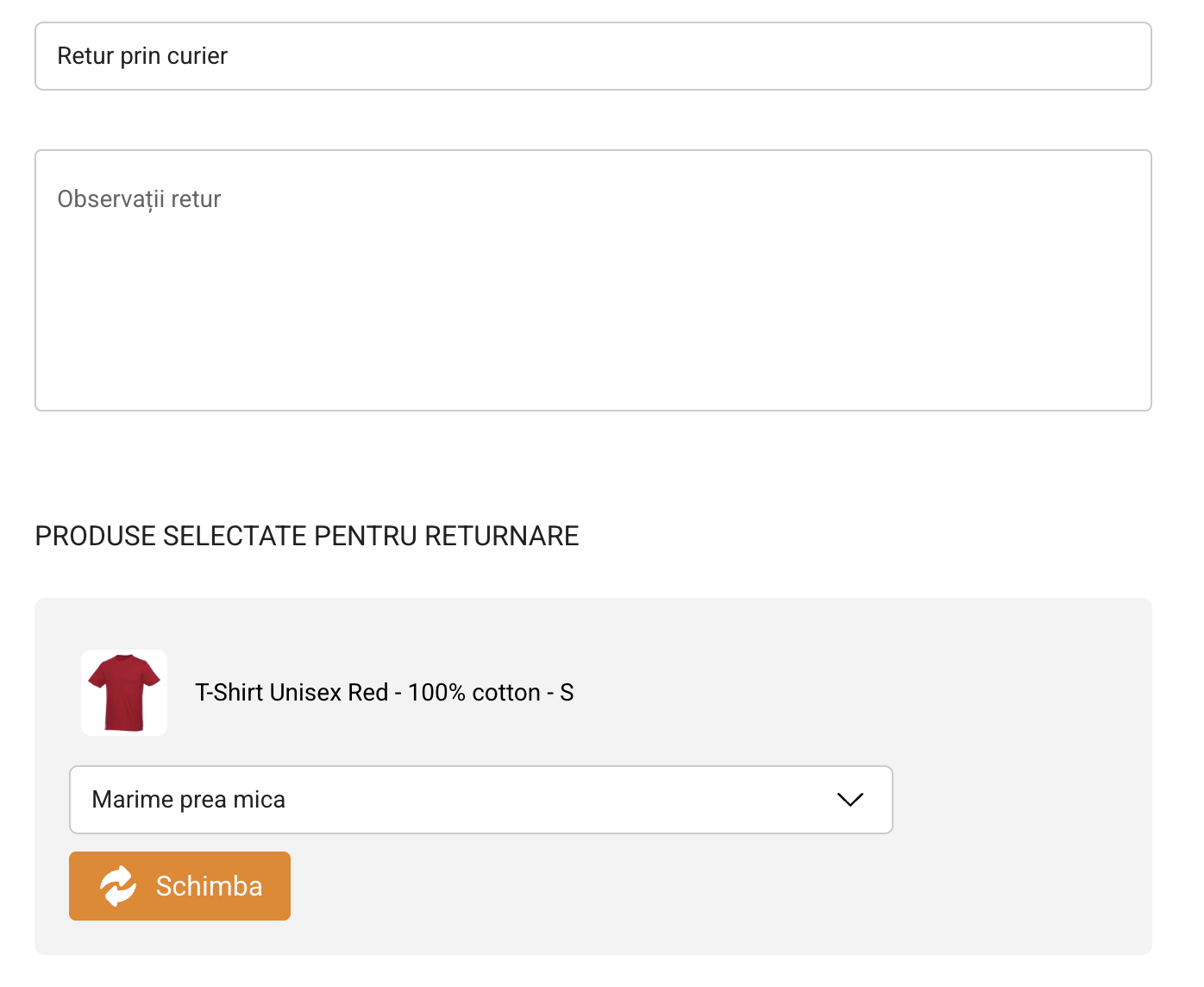 Pas 2: Selectarea produselor din comanda care se doresc a fi returnate/schimbate
