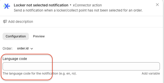 - A language code must be entered for each action where you want to control the notification language. One language code for one action