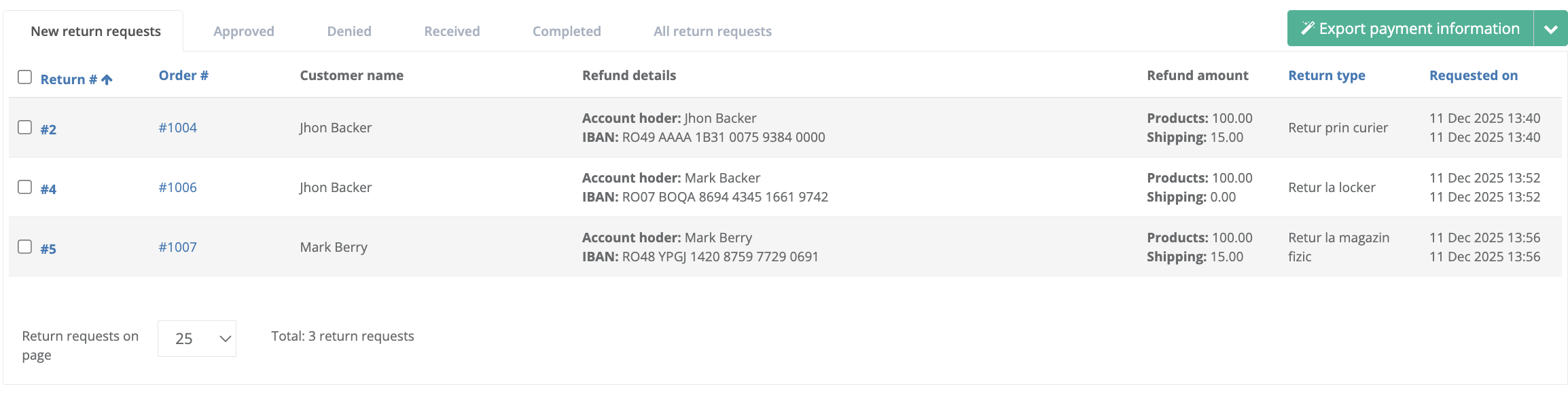 Pentru comenzile plasate cu plata ramburs, restituirea banilor catre clienti se efectueaza prin transfer bancar. Pentru a evita procesarea individuala a fiecarui transfer, se poate utiliza modulul de Cereri de retur gestionat prin Formularul de retur xConnector de pe site.
