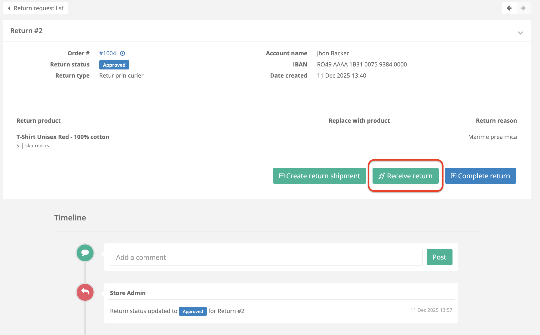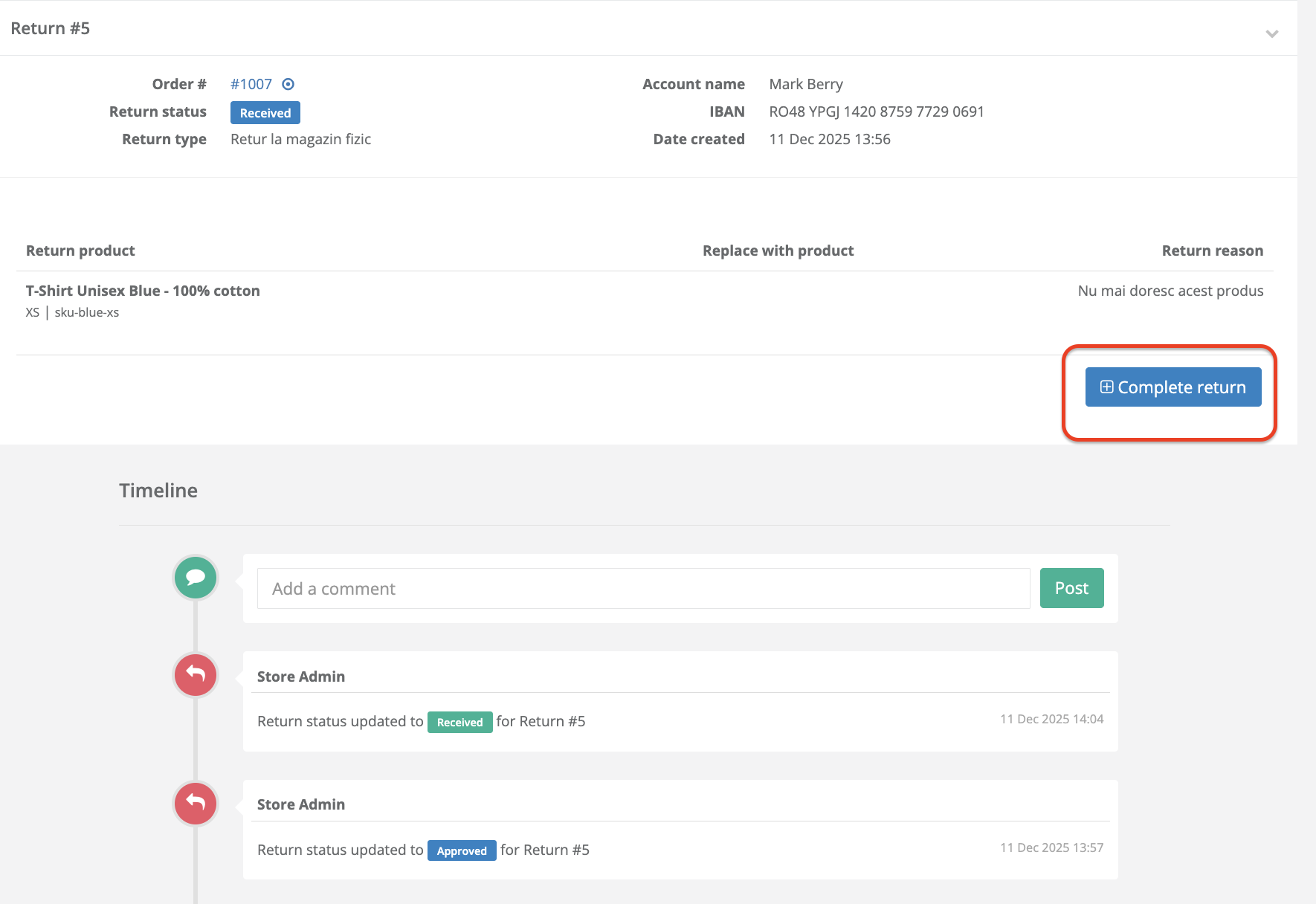 3. La primirea coletului retur, marchez statusul in aplicatie ca Received