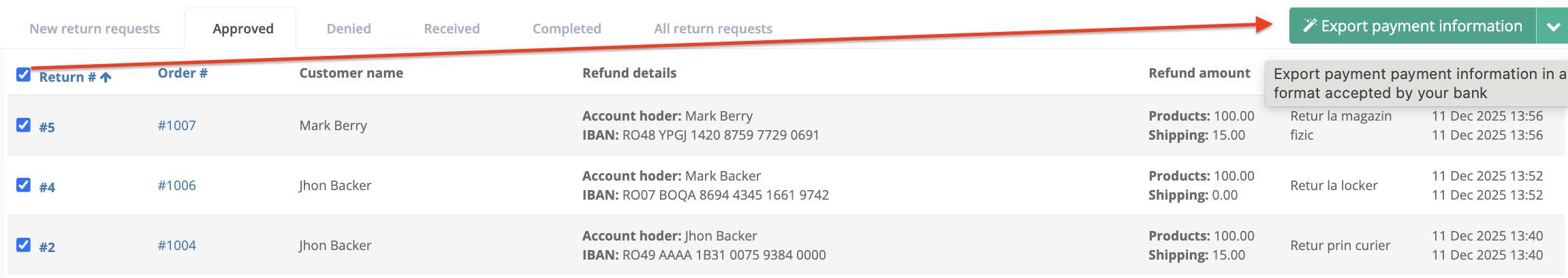 Se genereaza fisierul de export care contine datele necesare pentru procesarea rambursului in cont (ex.: nume, IBAN, suma).