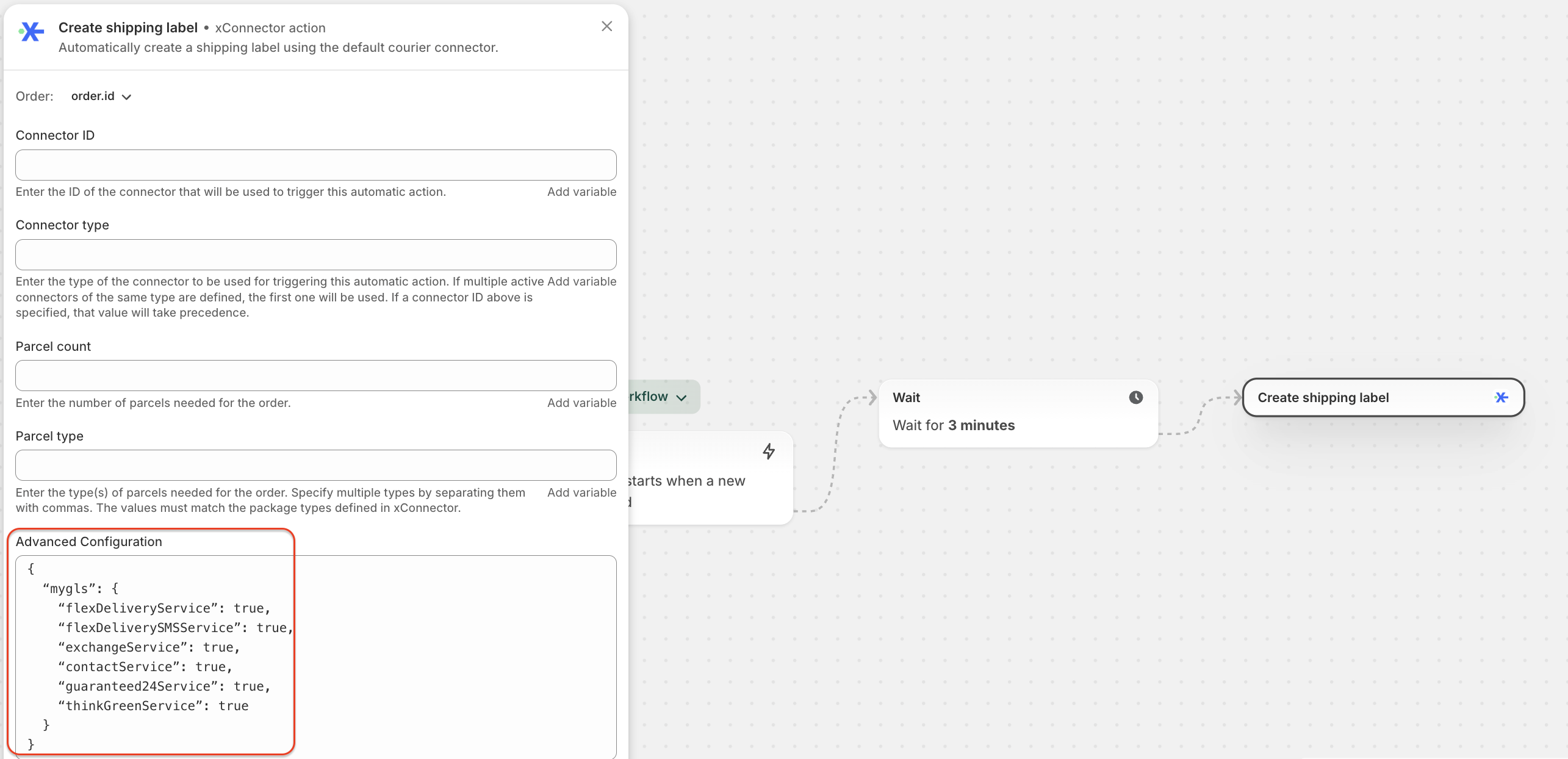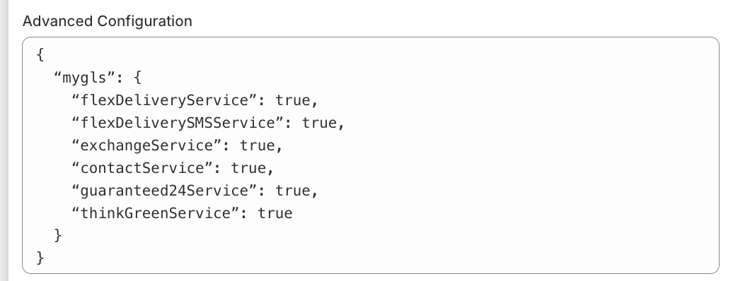 GLS services are configured in Shopify Flow → Advanced Configuration, where a JSON script containing the desired options is added.