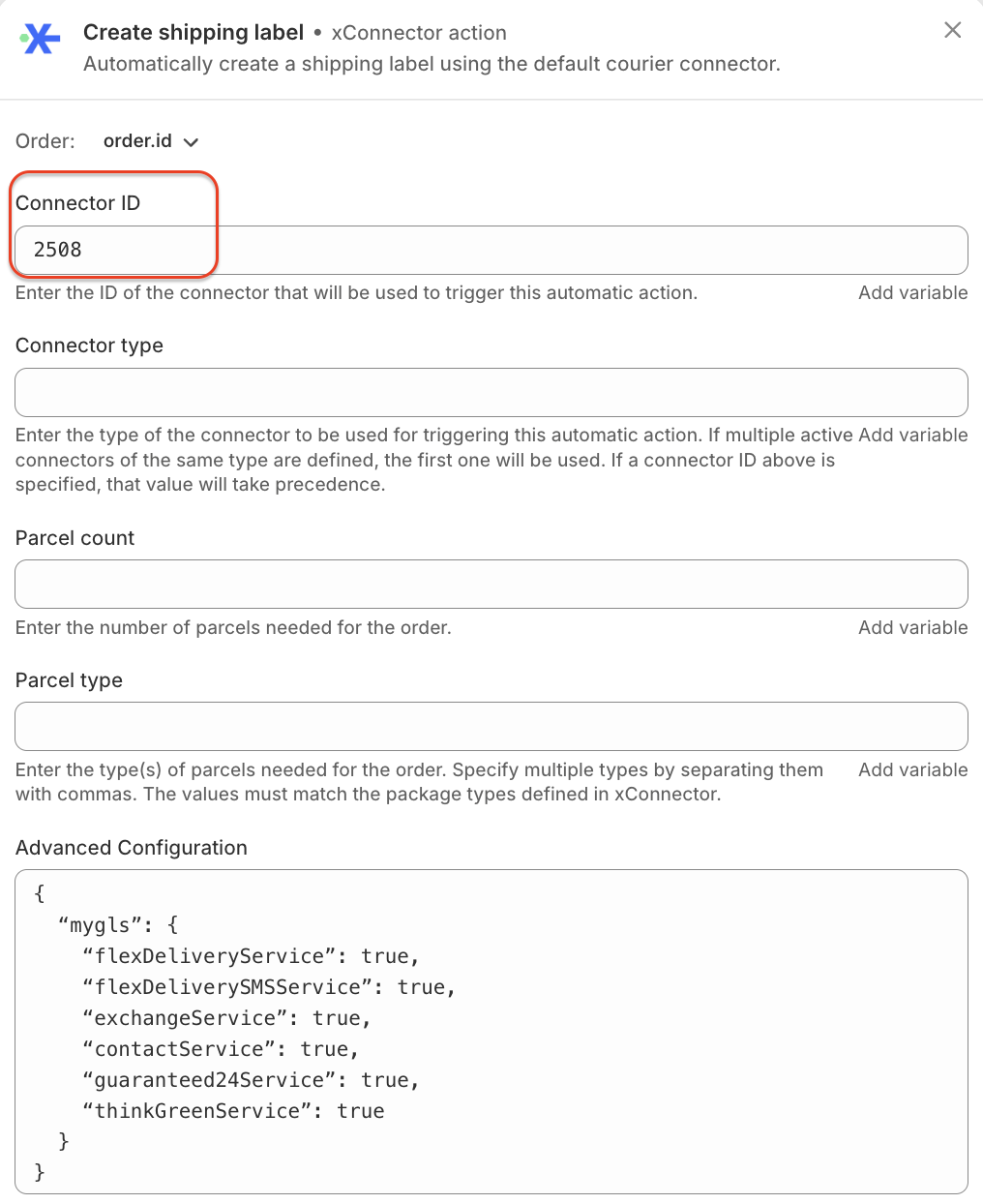 CASE 2: If shipping labels are generated through multiple carriers, the default carrier must be removed in xConnector → Profile → Preferences → Automation, and the connector ID is specified directly in the Flow.