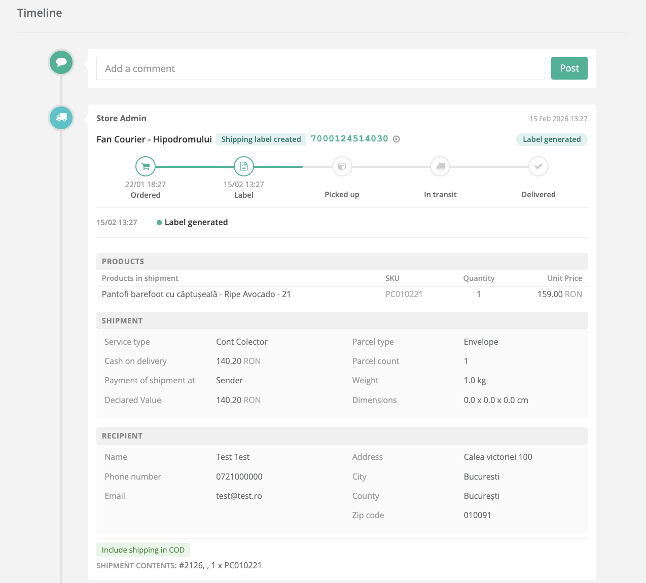 xConnector provides a shipment timeline for each generated shipping label. This allows you to track the shipment status and review the fulfilment details directly from the order page.